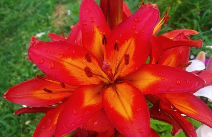 Лилия Fiamma (Фиамма). Цветок очень яркий и крупный (20 см). Цветок красный с оранжевой звездой. Высота 110 см.