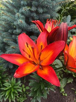 Лилии. Подходят для любого цветочного оформления участков. Низкорослые сорта и виды используют для посадок на бордюрах, высокие лилии используют для оформления дальнего плана и в солитерных посадках. Хороши они в группах, посаженные куртинами на газоне. Красиво смотрятся на фоне деревьев и кустарников и в сочетании со многими однолетниками и многолетниками. Некоторые низкорослые лилии можно применять для оформления каменистых участков.Используя при оформлении цветников лилии разного срока цветения, можно ими любоваться с июня до середины сентября.