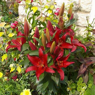 Лилии. Подходят для любого цветочного оформления участков. Низкорослые сорта и виды используют для посадок на бордюрах, высокие лилии используют для оформления дальнего плана и в солитерных посадках. Хороши они в группах, посаженные куртинами на газоне. Красиво смотрятся на фоне деревьев и кустарников и в сочетании со многими однолетниками и многолетниками. Некоторые низкорослые лилии можно применять для оформления каменистых участков. Используя при оформлении цветников лилии разного срока цветения, можно ими любоваться с июня до середины сентября.