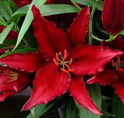 Лилия Firebolt (Фаеболт). Окраска выдающаяся — темно-бордовая с черным отливом. Цветки крупные (22 см). Лепестки заостренные, волнистые. Тычиночные нити белые, красиво выделяются на бордовом фоне. Пыльныки оранжевые. Высота 110 см.