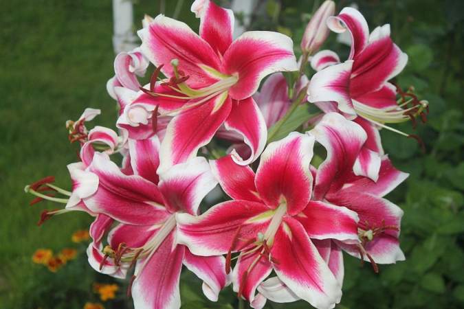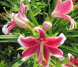 Лилии. Подходят для любого цветочного оформления участков. Низкорослые сорта и виды используют для посадок на бордюрах, высокие лилии используют для оформления дальнего плана и в солитерных посадках. Хороши они в группах, посаженные куртинами на газоне. Красиво смотрятся на фоне деревьев и кустарников и в сочетании со многими однолетниками и многолетниками. Некоторые низкорослые лилии можно применять для оформления каменистых участков.Используя при оформлении цветников лилии разного срока цветения, можно ими любоваться с июня до середины сентября.
