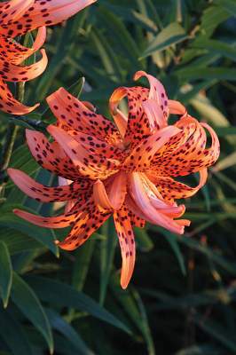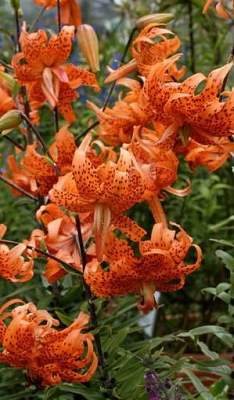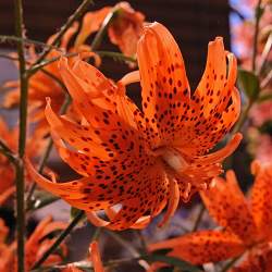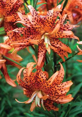Лилия тигровая Flore Pleno (Флоре Плено). Тигровая махровая (до 36 лепестков) лилия. Ярко-рыжая с черным крапом. По мере открывания цветка лепестки загибаются назад. Бульбоносна. Высота до 120 см. Размер цветка 9 см. Не имеет ярко-выраженного аромата. Цветет обильно!