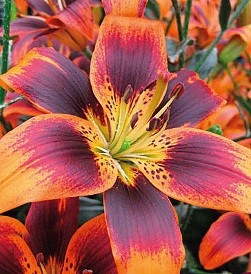 Лилия Forever Susan (Форева Сьюзан). Высота растения 80 см. Цветок оранжевый с бордовым, яркий. Цветки достигают до 10-12 см в диаметре.