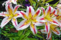 Восточные гибриды. Лилии поразительной красоты, их называют аристократами в мире лилий за экзотическую красоту необычайно привлекательных ароматных цветков. Цветки очень крупные, просто огромные, экзотических окрасок: бело-розовые, белые, малиновые, розовые с крапинками и полосками по центру волнистых лепестков или без них. Цветут в июле-сентябре. Необходимо солнечное место, хорошо защищенное от ветра, поскольку растения высокорослые с очень крупными цветками. Могут также расти в лёгкой тени деревьев. Главное правило — глубокая посадка, не менее 15 см, для защиты луковиц зимой.