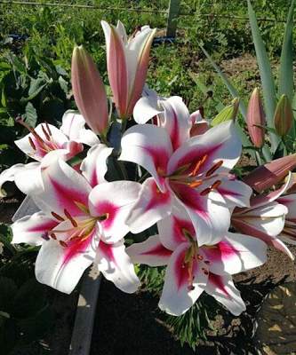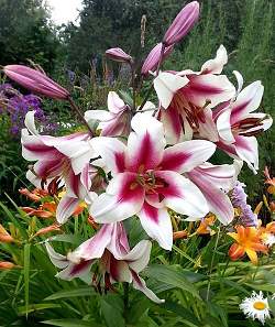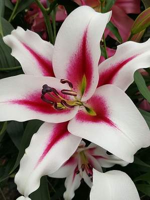 Лилия Gaucho (Гаучо). Цветок крупный, диаметром 20-22 см. Лепестки белые с насыщенно-малиновыми мазками из центра и темными пыльниками. Высота растения 120-135 см.