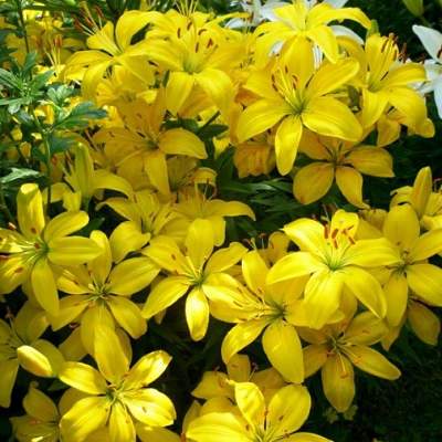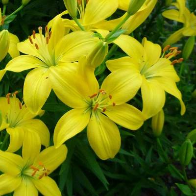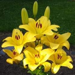 Лилия Gironde (Жиронда). Обильная, с жизнерадостной окраской. Лепестки чисто-желтые с легкой зеленцой у основания. Диаметр цветков 14 см. Высота 110 см.