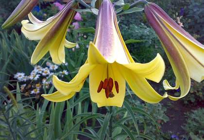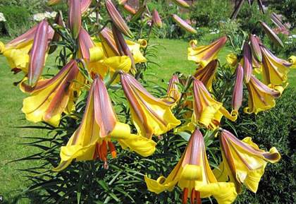 Лилия Golden Splendour (Голден Сплендэ). Очень известная и любимая садоводами лилия. Цветки трубчатые с закручивающимися лепестками. Внутренняя часть лепестка золотисто-желтая, внешняя — фиолетово-бронзовая. Цветки направлены в стороны; на одном растении до 15 цветков. Имеет сильный приятный аромат. Абсолютно морозостойка.