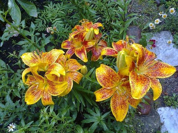 Лилии. Подходят для любого цветочного оформления участков. Низкорослые сорта и виды используют для посадок на бордюрах, высокие лилии используют для оформления дальнего плана и в солитерных посадках. Хороши они в группах, посаженные куртинами на газоне. Красиво смотрятся на фоне деревьев и кустарников и в сочетании со многими однолетниками и многолетниками. Некоторые низкорослые лилии можно применять для оформления каменистых участков.Используя при оформлении цветников лилии разного срока цветения, можно ими любоваться с июня до середины сентября.
