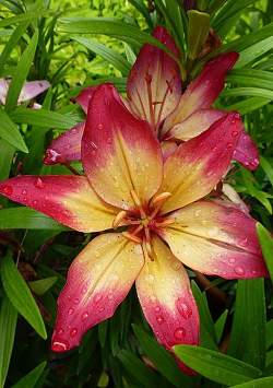 Лилия Heartstrings (Хатстрингс). Высота растения 80 см. Цветок крупный, двухцветный — желтый с красным. Лепестки слегка волнистые. Очень эффектная лилия.