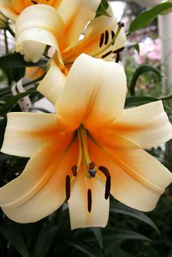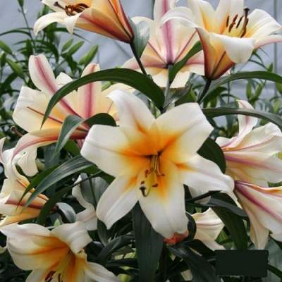 Лилия High Tea (Хай Ти). Диаметр цветка 25 см, высота 160 см. Имеет приятный аромат. Часто вырастают огромных размеров и имеют много очень крупных цветков. Предпочитают солнечное место и рыхлую, хорошо дренированную почву. Требуются регулярные подкормки комплексными удобрениями.