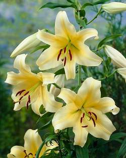Лилии. Подходят для любого цветочного оформления участков. Низкорослые сорта и виды используют для посадок на бордюрах, высокие лилии используют для оформления дальнего плана и в солитерных посадках. Хороши они в группах, посаженные куртинами на газоне. Красиво смотрятся на фоне деревьев и кустарников и в сочетании со многими однолетниками и многолетниками. Некоторые низкорослые лилии можно применять для оформления каменистых участков.Используя при оформлении цветников лилии разного срока цветения, можно ими любоваться с июня до середины сентября.