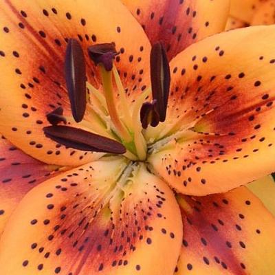 Лилия Hotel California (Отель Калифорния). Желто-оранжевый цветок с красно-бордовым мазком в середине лепестка и коричневым крапом, диаметр 20 см.