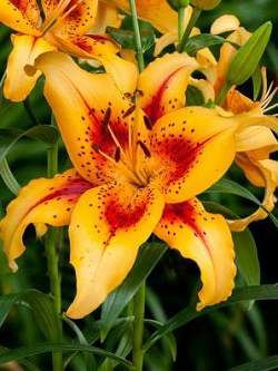 Лилии. Подходят для любого цветочного оформления участков. Низкорослые сорта и виды используют для посадок на бордюрах, высокие лилии используют для оформления дальнего плана и в солитерных посадках. Хороши они в группах, посаженные куртинами на газоне. Красиво смотрятся на фоне деревьев и кустарников и в сочетании со многими однолетниками и многолетниками. Некоторые низкорослые лилии можно применять для оформления каменистых участков.Используя при оформлении цветников лилии разного срока цветения, можно ими любоваться с июня до середины сентября.