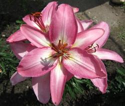 Лилия азиатская Ice Berry (Айс Берри). Цветок крупный, с эффектной окраской. Общий тон розовый, центр цветка белый. Диаметр цветка 15 см. Высота около 50 см. Неприхотлива, легко разрастается. Цветет обильно.