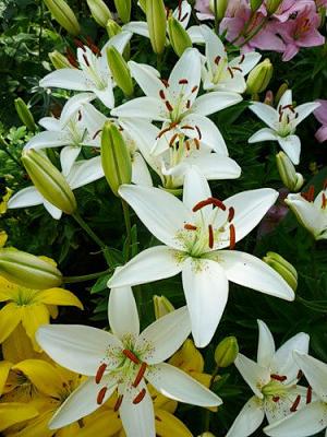 Лилии. Подходят для любого цветочного оформления участков. Низкорослые сорта и виды используют для посадок на бордюрах, высокие лилии используют для оформления дальнего плана и в солитерных посадках. Хороши они в группах, посаженные куртинами на газоне. Красиво смотрятся на фоне деревьев и кустарников и в сочетании со многими однолетниками и многолетниками. Некоторые низкорослые лилии можно применять для оформления каменистых участков.Используя при оформлении цветников лилии разного срока цветения, можно ими любоваться с июня до середины сентября.