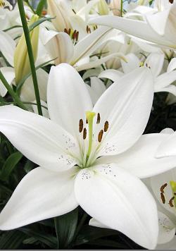 Лилия Ice Crystal (Айс Кристал). Высота растения 120 см, цветок белый с темным редким крапом в центре. Количество бутонов на одном растении 6-8.