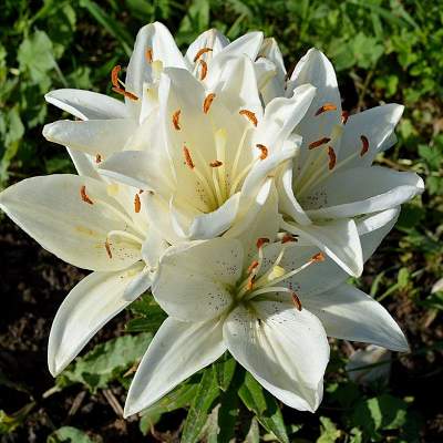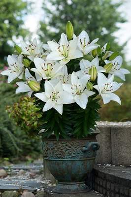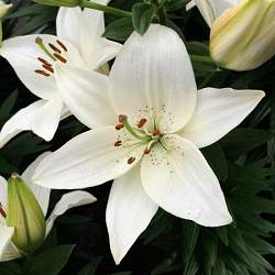 Лилия Inuvik (Инувик). Невысокая лилия, до 40 см. Отлично подходит для выращивания в контейнере. Цветки при этом крупные, до 15 см. Цветет обильно, целыми букетами. Цветки белые с изящным крапом.