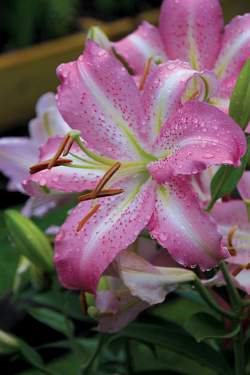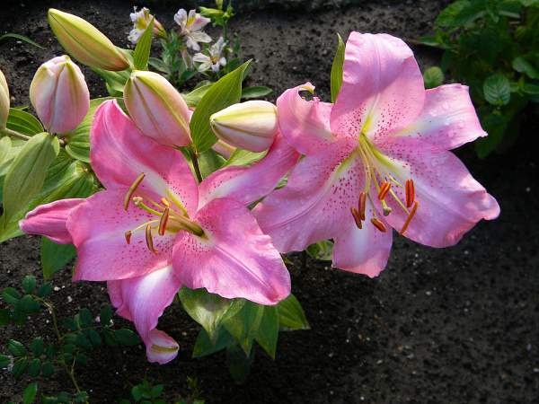 Восточные гибриды. Лилии поразительной красоты, их называют аристократами в мире лилий за экзотическую красоту необычайно привлекательных ароматных цветков. Цветки очень крупные, просто огромные, экзотических окрасок: бело-розовые, белые, малиновые, розовые с крапинками и полосками по центру волнистых лепестков или без них. Цветут в июле-сентябре. Необходимо солнечное место, хорошо защищенное от ветра, поскольку растения высокорослые с очень крупными цветками. Могут также расти в лёгкой тени деревьев. Главное правило — глубокая посадка, не менее 15 см, для защиты луковиц зимой.