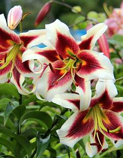 Лилии. Подходят для любого цветочного оформления участков. Низкорослые сорта и виды используют для посадок на бордюрах, высокие лилии используют для оформления дальнего плана и в солитерных посадках. Хороши они в группах, посаженные куртинами на газоне. Красиво смотрятся на фоне деревьев и кустарников и в сочетании со многими однолетниками и многолетниками. Некоторые низкорослые лилии можно применять для оформления каменистых участков.Используя при оформлении цветников лилии разного срока цветения, можно ими любоваться с июня до середины сентября.