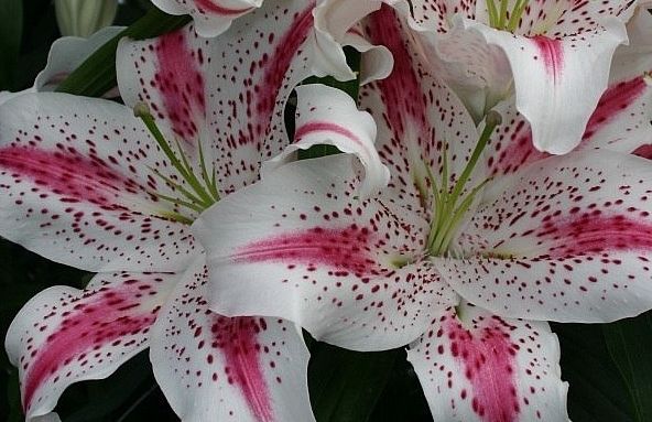 Восточные гибриды. Лилии поразительной красоты, их называют аристократами в мире лилий за экзотическую красоту необычайно привлекательных ароматных цветков. Цветки очень крупные, просто огромные, экзотических окрасок: бело-розовые, белые, малиновые, розовые с крапинками и полосками по центру волнистых лепестков или без них. Цветут в июле-сентябре. Необходимо солнечное место, хорошо защищенное от ветра, поскольку растения высокорослые с очень крупными цветками. Могут также расти в лёгкой тени деревьев. Главное правило — глубокая посадка, не менее 15 см, для защиты луковиц зимой.