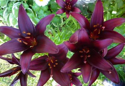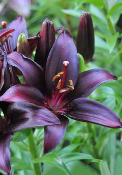Лилия Landini (Ландини). Сорт редкой черно-бордовой окраски с крупными цветками до 16 см в диаметре. Высота растения достигает 100-110 см. Период цветения лилии Landini ( Ландини) — июль.