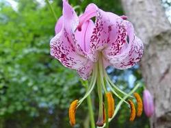 Цветки душистые, диаметром 6 см в кистевидных соцветиях по 10-15 чалмовидных поникших цветков. Листочки околоцветника длиной около 5 см, шириной 1,7-2 см, темно-розовые, внутри с многочисленными пятнышками. Пыльца коричневая с оттенком ржавчины. Цветет в конце июля.