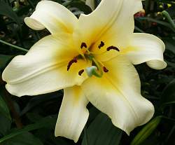 Лилия Late Morning (Лейт Монинг). Цветки крупные, диаметром 24 см, белые с большой желтой звездой. Высота 140 см. Цветки смотрят в стороны.