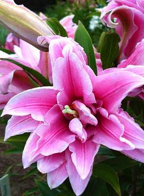 Лилия Lilac Cloud (Лилак Клауд). Цветки крупные, махровые, диаметром 20 см, лилово-розовые, с белой гофрированной каймой, чалмовидной формы, направлены вверх. Высота растения 100-120 см.