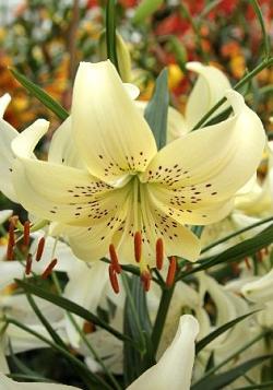Лилия Sweet Surrender (Свит Сёрэнде). Относится к группе Тигровых лилий. Диаметр цветка достигает 14 см. Окрас цветка бледно-желто-зеленый, горло желтое. Крап темно-красный. Высота: 110-130 см.