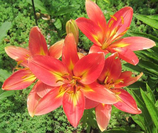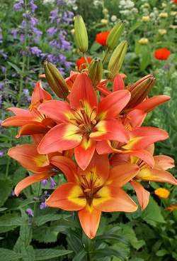 Лилии. Подходят для любого цветочного оформления участков. Низкорослые сорта и виды используют для посадок на бордюрах, высокие лилии используют для оформления дальнего плана и в солитерных посадках. Хороши они в группах, посаженные куртинами на газоне. Красиво смотрятся на фоне деревьев и кустарников и в сочетании со многими однолетниками и многолетниками. Некоторые низкорослые лилии можно применять для оформления каменистых участков.Используя при оформлении цветников лилии разного срока цветения, можно ими любоваться с июня до середины сентября.