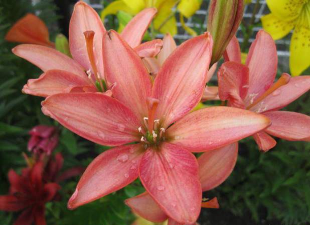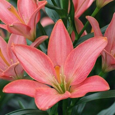 Лилия Little Kiss (Литл Кисс). Лилия генетически без пыльцы. Цветки приятной лососевой окраски, с оранжевой тонкой окантовкой, кубковидные, направлены вверх. Лепестки красивой овальной формы, гладкие, фактура плотная. В период цветения цветки длительное время остаются в полуроспуске и не разваливаются, что удобно для составления букетов.