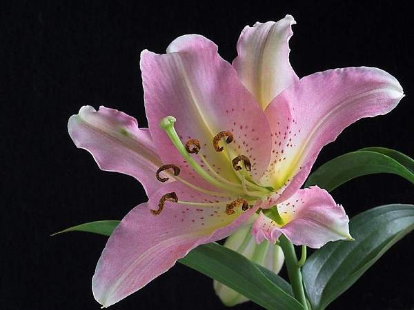 Лилия Lombardia (Ломбардия). Высота растения 115 см, цветок нежно-розовый с желтым основанием, в центре мелкий крап, край волнистый. Цветок очень крупный.