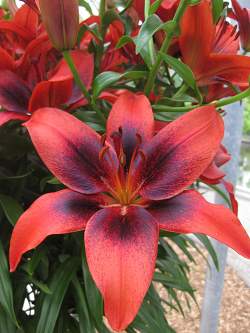 Лилия London Heart (Лондон Харт). Серия Танго. Красная с многочисленными красно-коричневыми крапинками на лепестках вокруг центра. Диаметр цветка 20 см, высота 110 см. Азиатские лилии предпочитают солнечное или полутенистое место, плодородную хорошо дренированную почву, хорошо зимуют в Подмосковье, цветут в середине лета 2-4 недели.