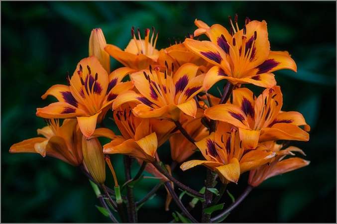 Лилия азиатская Loreto (Лорето). Очень привлекательная лилия. Цветки крупные (19 см), собраны в букеты. Лепестки ярко-оранжевые с фиолетовым штрихом у основания. Стебли темные. Изящная. Высота 110 см.