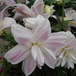 Восточные гибриды. Лилии поразительной красоты, их называют аристократами в мире лилий за экзотическую красоту необычайно привлекательных ароматных цветков. Цветки очень крупные, просто огромные, экзотических окрасок: бело-розовые, белые, малиновые, розовые с крапинками и полосками по центру волнистых лепестков или без них. Цветут в июле-сентябре. Необходимо солнечное место, хорошо защищенное от ветра, поскольку растения высокорослые с очень крупными цветками. Могут также расти в лёгкой тени деревьев. Главное правило — глубокая посадка, не менее 15 см, для защиты луковиц зимой.