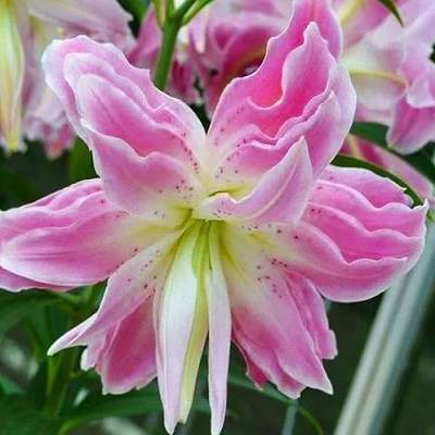 Лилия Lotus Elegance (Лотус Элеганс). Густомахровый, розовый со светлым кантом и центром, малиновый крап, гофре по краю, без пыльцы, направлены вверх, зацветают в конце июля-начале августа, имеют насыщенный аромат. Высота растения 100 см.