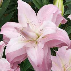 Лилия Lotus Queen (Лотус Куин). Новая серия махровых лилий, по форме напоминающих лотос. Цветок многослойный, светло-розовый. Центр значительно бледнее, края более насыщенные по окраске, загнуты вниз.