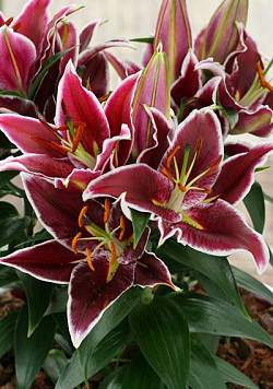 Лилия Magny-Cour (Маньи-Кур). Цвет очень темный, бордовый, по краю лепестков контрастная белая кайма. Крап бордовый. Пыльники оранжевые. Диаметр цветка 15 см. Высота 30-40 см. Идеальна для выращивания в кашпо.