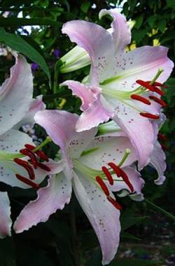 Восточные гибриды. Лилии поразительной красоты, их называют аристократами в мире лилий за экзотическую красоту необычайно привлекательных ароматных цветков. Цветки очень крупные, просто огромные, экзотических окрасок: бело-розовые, белые, малиновые, розовые с крапинками и полосками по центру волнистых лепестков или без них. Цветут в июле-сентябре. Необходимо солнечное место, хорошо защищенное от ветра, поскольку растения высокорослые с очень крупными цветками. Могут также расти в лёгкой тени деревьев. Главное правило — глубокая посадка, не менее 15 см, для защиты луковиц зимой.
