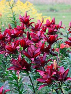 Лилии. Подходят для любого цветочного оформления участков. Низкорослые сорта и виды используют для посадок на бордюрах, высокие лилии используют для оформления дальнего плана и в солитерных посадках. Хороши они в группах, посаженные куртинами на газоне. Красиво смотрятся на фоне деревьев и кустарников и в сочетании со многими однолетниками и многолетниками. Некоторые низкорослые лилии можно применять для оформления каменистых участков.Используя при оформлении цветников лилии разного срока цветения, можно ими любоваться с июня до середины сентября.