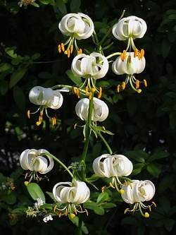 Лилия-мартагон Album (Альбум). Предпочитает влажные полутенистые места. Продолжительно и обильно цветет. Относится к редким видам, многоцветковая. Цветки диаметром 10-15 см, чалмовидные, белого цвета, с жёлтыми тычинками, до 50 цветков на одном растении.