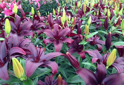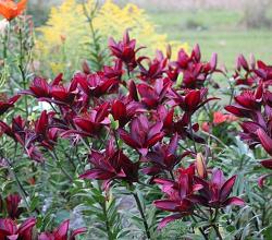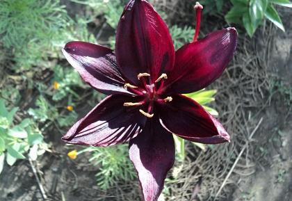 Лилия Mascara (Маскара). Цветки роскошные — темно-вишневые с пурпурным оттенком, диаметром 14 см. Высота 70 см.