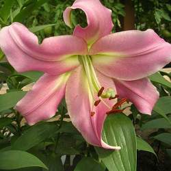 Лилия Maywood (Мэйвуд). Цветки крупные, диаметром 28 см, нежно-розовые с желтоватым центром и ярко-розовым крапом. Высота 110 см.