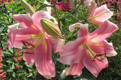 Лилии. Подходят для любого цветочного оформления участков. Низкорослые сорта и виды используют для посадок на бордюрах, высокие лилии используют для оформления дальнего плана и в солитерных посадках. Хороши они в группах, посаженные куртинами на газоне. Красиво смотрятся на фоне деревьев и кустарников и в сочетании со многими однолетниками и многолетниками. Некоторые низкорослые лилии можно применять для оформления каменистых участков.Используя при оформлении цветников лилии разного срока цветения, можно ими любоваться с июня до середины сентября.