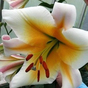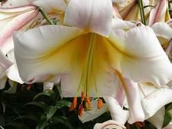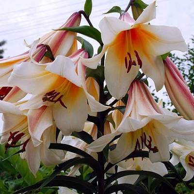 Лилия Miss Peculair (Мисс Пекьюлар). Новинка 2015 года. Цветки кремовые с розоватым румянцем, желтым центром и тёмно-розовой полосой по тыльной стороне лепестка; пыльники красно-коричневые, рыльце пурпурное. Цветки диаметром 27 см; воронковидные, направлены в стороны и вниз.