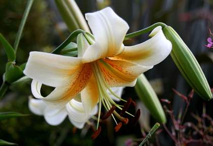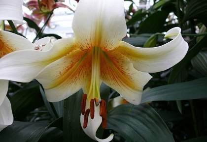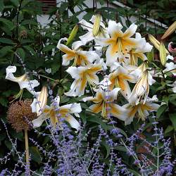 Лилия Mister Cas (Мистер Кас). Цветки бело-желтые, очень крупные, направленные вниз. Лепестки волнистые, они элегантно загибаются назад, открывая желто-оранжевый центр с продолговатыми пятнами. Высота растения до 90-120 см. Со временем эта лилия превратится в настоящего гиганта с 20 душистыми цветками около 20 см в диаметре.
