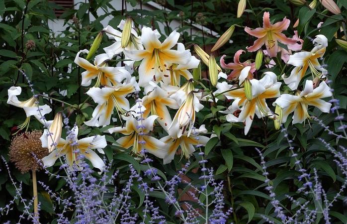 Лилии. Подходят для любого цветочного оформления участков. Низкорослые сорта и виды используют для посадок на бордюрах, высокие лилии используют для оформления дальнего плана и в солитерных посадках. Хороши они в группах, посаженные куртинами на газоне. Красиво смотрятся на фоне деревьев и кустарников и в сочетании со многими однолетниками и многолетниками. Некоторые низкорослые лилии можно применять для оформления каменистых участков.Используя при оформлении цветников лилии разного срока цветения, можно ими любоваться с июня до середины сентября.