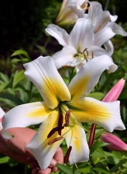 ОТ-гибриды. Были получены в результате скрещиваний между лилиями групп Oriental (Восточные) и Trumpet (Трубчатые), а также между их гибридами. ОТ-гибриды дают прекрасную срезку и хорошо переносят транспортировку, подходят для выращивания в открытом грунте. Цветки — очень крупные широкочашевидной или воронковидной формы, направлены вверх или в сторону. Растения обладают прочными, крепкими побегами. Требуют хорошо освещенных мест с защитой от ветра. Необходимы дренированные почвы с нейтральной реакцией. С наступлением первых заморозков, до промерзания почвы, желательно замульчировать посадки листьями или торфом, смешанными с листовым перегноем, на высоту 10-15 см.