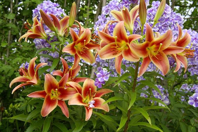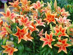 Лилии. Подходят для любого цветочного оформления участков. Низкорослые сорта и виды используют для посадок на бордюрах, высокие лилии используют для оформления дальнего плана и в солитерных посадках. Хороши они в группах, посаженные куртинами на газоне. Красиво смотрятся на фоне деревьев и кустарников и в сочетании со многими однолетниками и многолетниками. Некоторые низкорослые лилии можно применять для оформления каменистых участков.Используя при оформлении цветников лилии разного срока цветения, можно ими любоваться с июня до середины сентября.