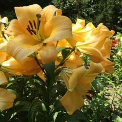 Лилия Morini (Морини). Цветок абрикосово-желтый с коричневыми пыльниками,диаметром 18-20 см. Высота взрослого растения до 110 см.